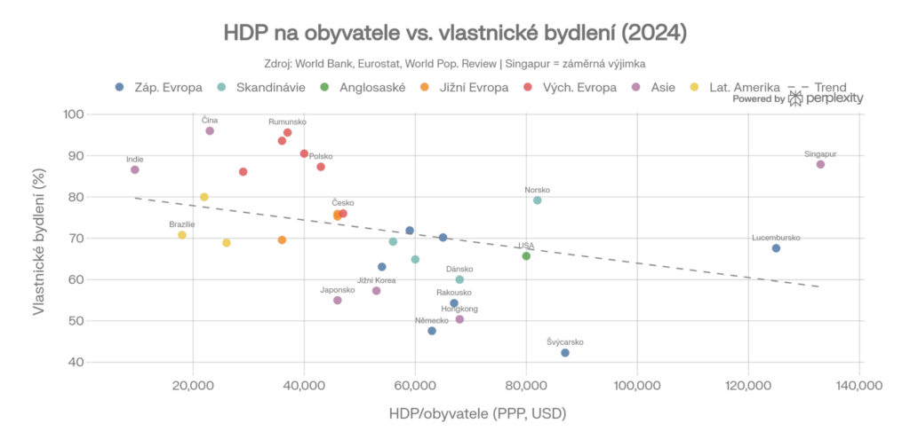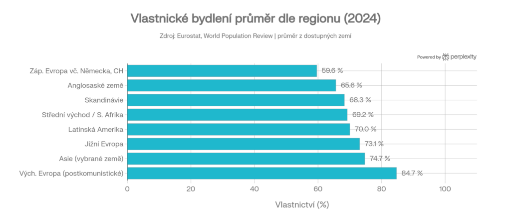 Východoevropské státy mají nejvyšší míru vlastnického bydlení na světě, a důvod je historický. Po pádu komunismu v roce 1989 dostali nájemníci ve státních bytech možnost odkoupit je za symbolické ceny – v Rumunsku doslova za ekvivalent jednoho měsíčního platu. V České republice bylo 90% komunálních bytů zprivatizováno. Tato masová privatizace státního bytového fondu přes noc vytvořila ze statisíců nájemníků vlastníky. V Česku pak podíl vlastnictví sice klesal (z ~79 % v roce 2020 na 75 % v roce 2024), ale stále výrazně převyšuje průměr EU.