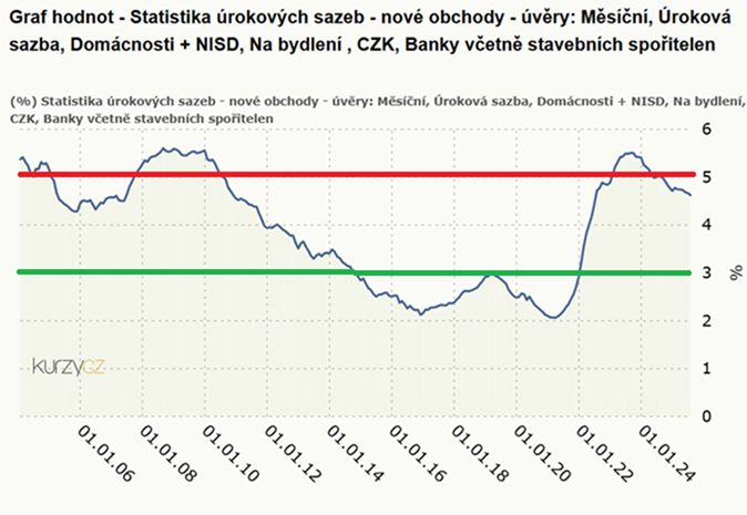 Období okolo roku 2005 bylo charakteristické mnohem vyššími sazbami (často kolem 6% i výše). 📊