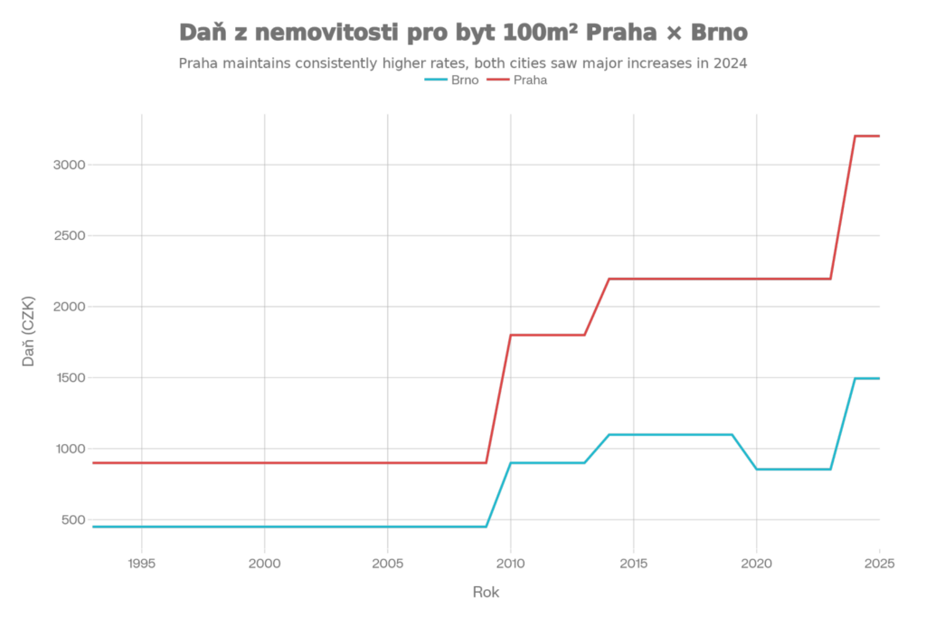 Pro orientační srovnání jsem ale sestavil vývoj daně z nemovitosti v Brně a Praze pro vzorový byt 100 m².