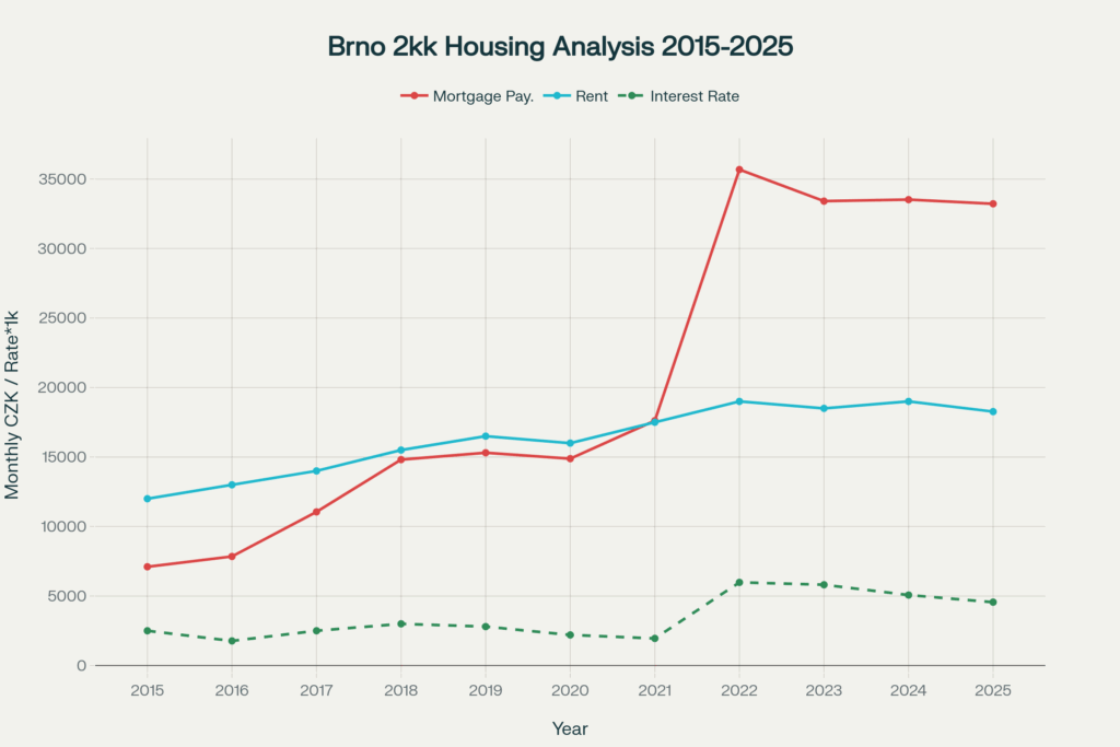 V letech 2015–2020 bylo vlastnické bydlení jasně ekonomicky výhodnější než platit nájemné 💰. Díky nízkým úrokovým sazbám byla splátka hypotéky často nižší než platba nájemného. Každému, kdo dosáhl na hypotéku, se vyplatilo si pořídit vlastní bydlení 🏡. K tomu individuální investoři začali v tomto období ve velkém nakupovat investiční byty na hypotéky 👤💼.
